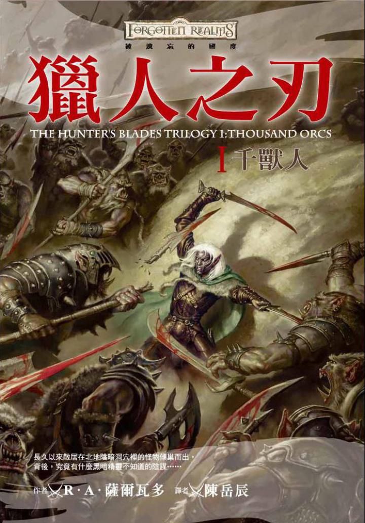 猎人之刃三部曲第一部《千兽人》(The Thousand Orcs)。因为冈达伦王的骤逝,骁勇善战的矮人布鲁诺不得不返回秘银厅继位,而崔斯特一行人从冰风谷返回秘银厅的途中,不断听闻兽人袭击车队、村庄、城镇的消息,种种迹象显示这一连串侵略行动。